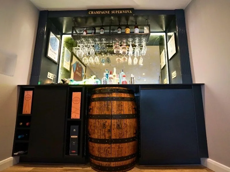 Others prefer a warm, traditional pub-style setup with timber detailing, brass fittings, and comfortable seating. For a versatile social space, combine the bar with a lounge area, bi-fold doors, and a decked terrace to extend the space outdoors. Some clients even include a projector or sound system for sports events or film nights. Every element of the bar from the layout to the finishes can be tailored to match your style and how you plan to use the space.