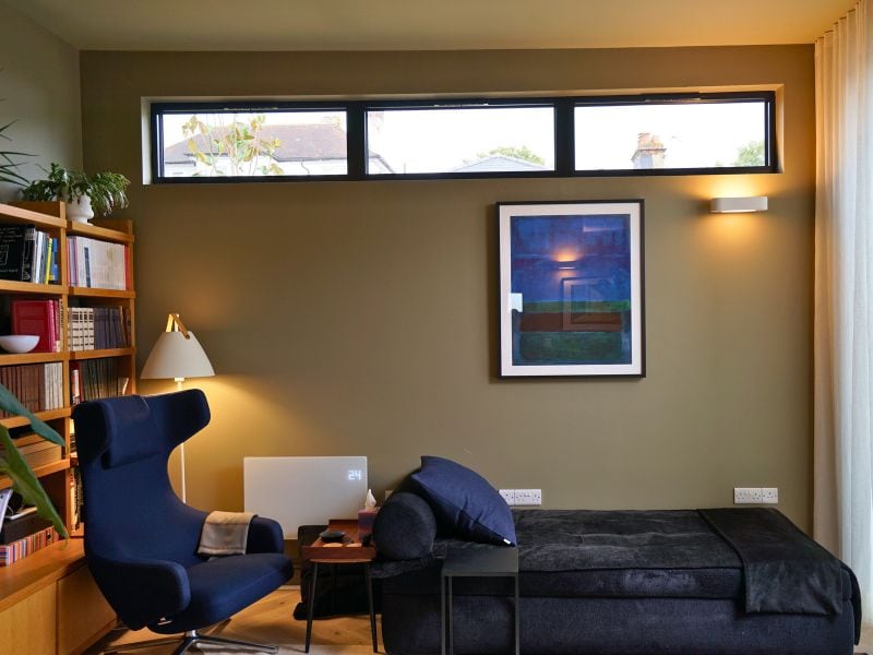 This extra height, combined with the carefully chosen custom wall colours, has created a space that feels airy yet intimate, an ideal setting for therapy sessions. With planning permission sorted and no delays, we were able to focus on delivering a garden room that perfectly fits the therapist’s vision and the needs of her clients.