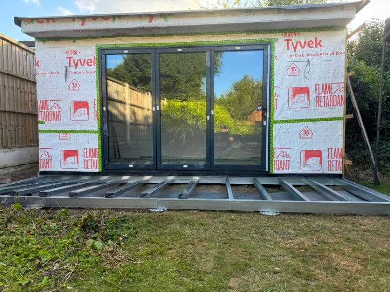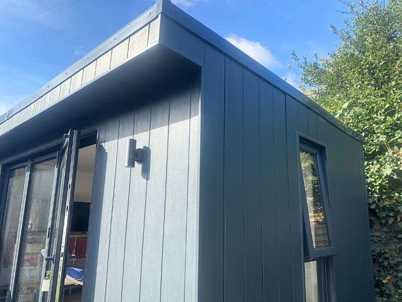 Our clients were looking for a low maintenance garden room office that could be used all year round. The room will also double up as an entertaining space, so they were keen on the large bi-fold doors that would open up onto a deck area.