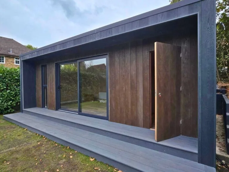 The completed build mirrors the CGI vision with absolute accuracy, reflecting our commitment to precision and detail. Clad in Millboard, the garden room offers a contemporary, durable finish, while Bluestone’s landscaping frames the structure perfectly, elevating the overall design. The outcome is a sophisticated outdoor space where the garden room and landscaped setting merge effortlessly into one, delivering both function and elegance.