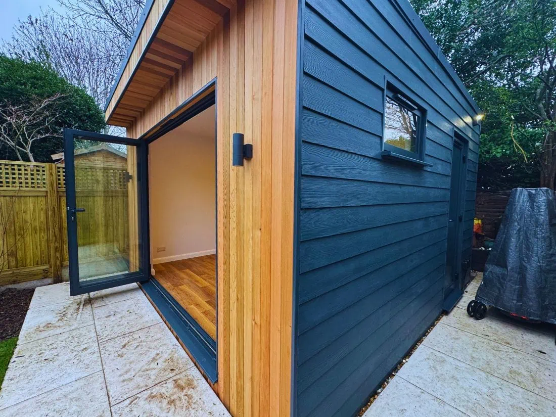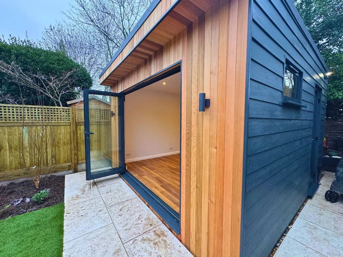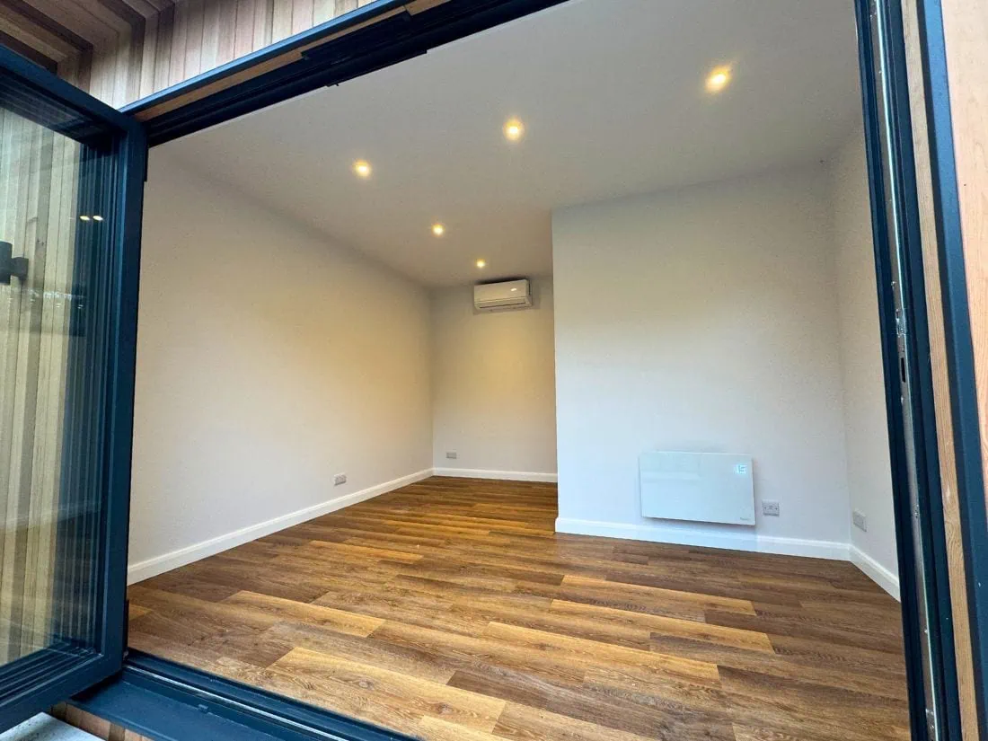 Using ground screw foundations, we delivered a bespoke, high-ceiling garden room tailored to the family’s needs, overcoming challenges from neighbouring oak trees. With planning permission secured, this custom space combines functionality, durability, and design, perfect as a home gym for a tall-height family.