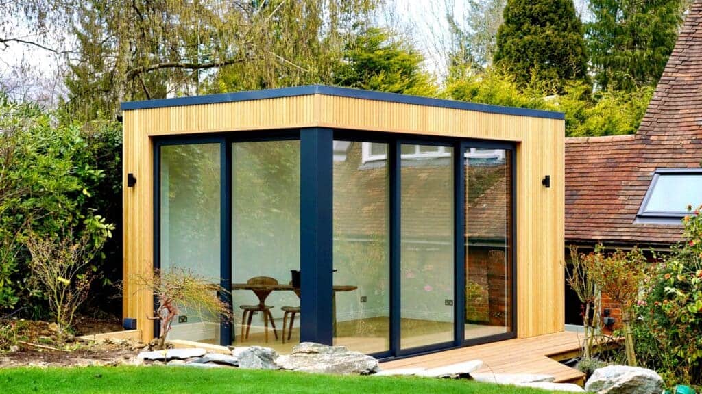 A garden office provides a professional setting for meetings and video calls, helping to maintain a polished image while working from home.